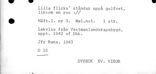 //// & //// Lilla flicka' ståndar uppå golfvet, //// liksom en ros : //// //^ Häft.I. nr 3. Mel.not. 1 str. //// Lekvisa från Vestmanlandskapsbygd, //// uppt. 1842 af Dbk. //// : Jfr Runa, 1843 //// D 18 //// DYBECK SV. VISOR ////