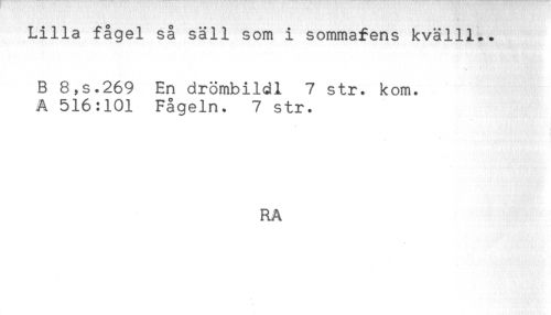 //// Lilla fågel så säll som i sommafens kvälli.. //// B 8,s.269 En drömbildl 7 str. kom. //// A 516:101 Fågeln. 7 str. //// RA ////