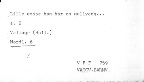 //// Lille gosse han har en gullvang... //// s. 2 //// Valinge (Hall.) //// Nordl. 6 //// //// /V F F 759 //// VAGGV.BARNV. //// .....r-\ . -. //// /