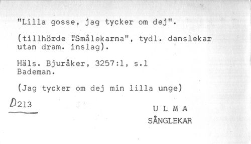 //// ] //// "Lilla gosse, jag tycker om dej". //// (tillhörde "Smålekarna", tydl. danslekar //// utan dram. inslag). //// Hals. Bjuråker, 3257:1, s.l //// Bademan. //// (Jag tycker om dej min lilla unge) //// ^iL u L M A //// SÅNGLEKAR ////