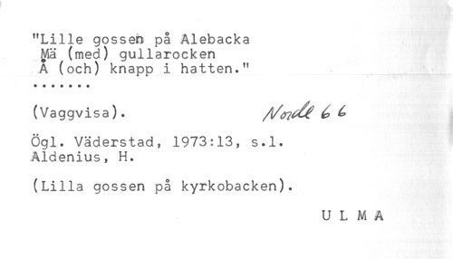 //// "Lille gossen på Alebacka //// ^ä (med) gullarocken //// A (och) knapp i hatten." //// (Vaggvisa). ^ ^ //// Ögl. Väderstad, 1973:13, s.l. //// Aldenius, H. //// (Lilla gossen på kyrkobacken). //// U L M A ////