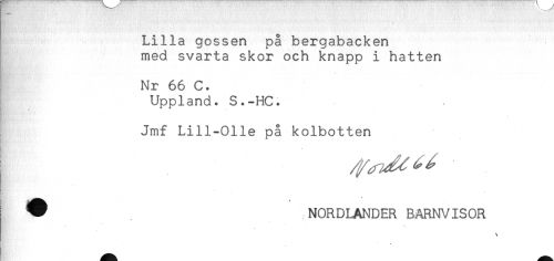 //// Lilla gossen på bergabacken //// med svarta skor och knapp i hatten //// Nr 66 C. //// Uppland. S.-HC. //// * * //// Jmf Lill-Olle på kolbotten //// v ' //// ^ NORDLANDER BARNVISOR ////