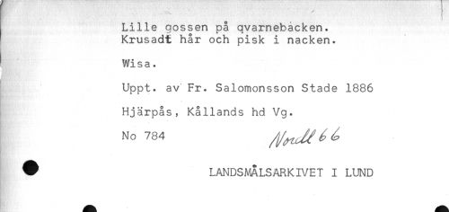 //// F-' * ) //// Lille gossen på qvarnebåcken. //// Krusadt hår och pisk i nacken. //// Wisa. //// Uppt. av Fr. Salomonsson Stade 1886 //// * //// * //// Hjärpås, Kållands hd Vg. //// ** //// No 784 ^^ ^ ^ //// ^ LANDSMÅLSARKIVET I LUND //// . ////