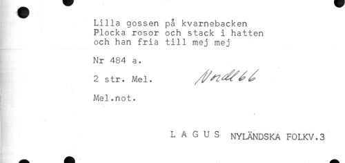 //// Lilla gossen på kvarnebacken //// Plocka rosor och stack i hatten //// och han fria till mej mej //// Nr 484 a. //// 2 str. Mel. //// Mel.not. //// L A G U S NYLÄNDSKA F0LKV.3 ////
