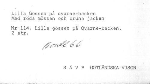 //// ! //// Lilla Gossen på qvame-hacken //// Med röda mössan och bruna jackan //// Nr 114, Lilla gossen på Qvarne-backen, //// 2 str. //// S Ä V E GOTLÄNDSKA VISOR ////