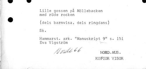 //// * //// Lille gossen på Möllebacken //// med röde rocken //// (dels barnvisa, dels ringdans) //// ! //// Sk. //// i //// / Hammarst. ark. "Manuskript 9" s. 151 //// Eva Vigström — //// ^^ ^ NORD. MUS. //// KOPIOR VISOR //// C ////