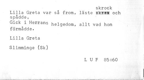 //// skrock //// Lilla Greta var så from, läste och //// spådde, //// Gic\i Heléns helgedom, allt vad hon //// förmådde. //// Lilla Greta //// < //// < //// <- - //// Slimminge (Sk) //// L U F 85:60 //// < //// < //// ! //// . //// * //// ____ . ___ _ _____ _ ^ . , _____ _ . ////