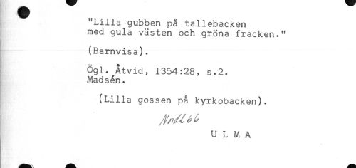 //// "Lilla gubben på tallebacken //// med gula västen och gröna fracken." //// (Barnvisa). //// Ögl. Åtvid, 1354:28, s.2. //// Madsén. //// (Lilla gossen på kyrkobacken). //// i //// U L M A ////
