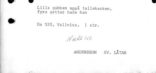//// Lilla gubben uppå tallebacken, //// fyra getter hade han //// ! ^ Da 520, Vallvisa, 1 str. //// * //// ANDERSSON SV. LÅTAR ////