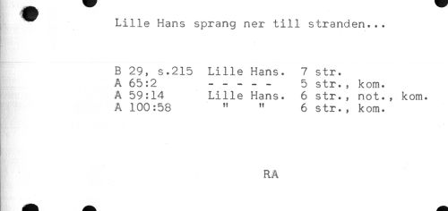 //// Lille Hans sprang ner till stranden... //// B 29, s.2.15 Lille Hans. 7 str. //// A 65:2 ----- 5 str., kom. //// A 59:14 Lille Hans. 6 str., not., kom. //// A 100:58 " " 6 str., kom. //// RA ////