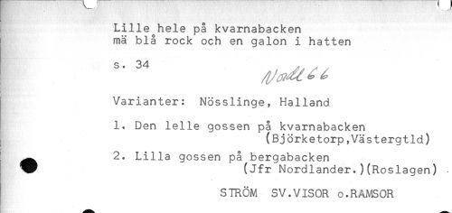 //// ! //// Lille hele på kvarnabacken //// mä blå rock och en galon i hatten //// s. 34 //// Varianter: Nösslinge, Halland //// 1. Den lelle gossen på kvarnabacken //// (Björketorp,Västergtld) //// ^^ 2. Lilla gossen på bergabacken //// * (Jfr Nordlander.)(Roslagen) //// STRÖM SV.VISOR o.RAMSOR ////