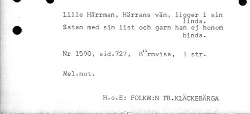 //// ! , Lille Härrman, Härrans vän, ligger i sin //// linda. //// ^ Satan med sin list och garn han ej honom //// ^^ binda. //// Nr 1590, sid.727, Barnvisa, 1 str. //// - //// Mel.not. //// . //// H.o.E: F0LKM:N FR.KLÄCKEBÄRGA //// ***, * t*'** *) * * - ////