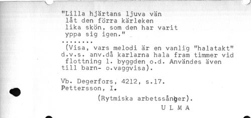 //// "Lilla hjärtans ljuva vän //// låt den förra kärleken //// lika skön, som den har varit //// yppa sig igen." //// (Visa, vars melodi är en vanlig "halatakt" //// d.v.s. anv.då karlarna hala fram timmer vid //// flottning 1. byggden o.d. Användes även //// till barn- o.vaggvisa). //// * //// Vb. Degerfors, 4212, s.17. //// ^^ Pettersson, 1. //// (Rytmiska arbetssån^er). //// U L M A ////