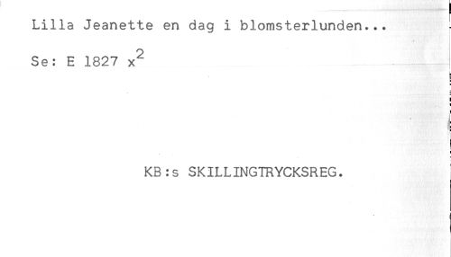 //// Lilla Jeanette en dag i blomsterlunden... //// * //// Se: E 1827 x^ //// < //// B //// E //// * //// ! //// t //// KB:s SKILLINGTRYCKSREG. ////