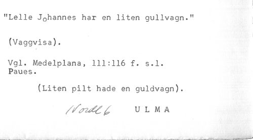//// "Lelle Johannes har en liten gullvagn." i //// < //// (Vaggvisa). //// * //// Vgl. Medelplana, 111:116 f* s.l. //// Paues. //// (Liten pilt hade en guldvagn). //// U L M A ////