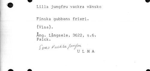 //// Lilla jungfru vackra vänsko //// Finska gubbens frieri. //// (Visa). //// ** o //// Ang. Langsele, 3622, s.6. //// Falck. //// U L M A ////