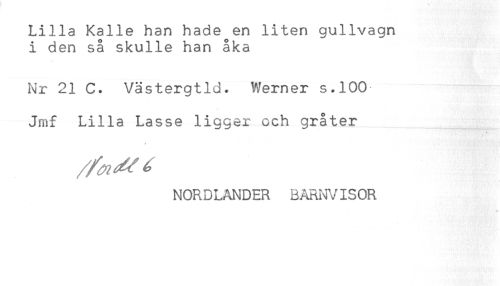 //// Lilla Kalle han hade en liten gullvagn //// i den så skulle han åka //// Nr 21 C. Västergtld. Werner s.100 //// Jmf Lilla Lasse ligger och gråter //// NORDLANDER BARNVISOR ////