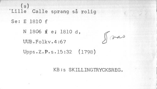 //// . . ^ //// Lille Calle sprang så rolig //// Se: E 1810 f //// < < //// N 1806 f e; 1810 d, ^ //// } . ^^ //// UUB.Folkv.4:67 //// Upps.Z.P.s.15:32 (1798) //// < //// KB:s SKILLINGTRYCKSREG. //// y ////