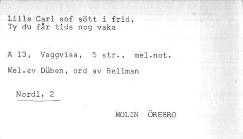 //// '; ', '. t f. - < -.-<y' //// Lille Carl sof sött i frid, //// Ty du får tids nog vaka //// A 13, Vaggvisa, 5 str., mel.not. //// Mel.av Duben, ord av Bellman //// Nordl. 2 //// iVDLIN ÖREBRO ////