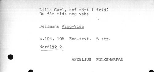 //// Lilla Carl, sof sött i fridf //// Du får tids nog vaka //// Bellmans Vaga-Visa //// s.104, 105 End.text. 5 str. //// NordliX 2. //// * AFZELIUS FOLKSHARPAN ////