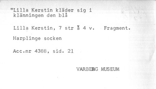 //// "Lilla Kerstin kläder sig i //// klänningen den blå //// Lilla Kerstin, 7 str å 4 v. Fragment. //// t //// Harplinge socken //// Acc.nr 4388, sid. 21 //// VARBEBG MUSEUM ////