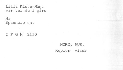 //// Lilla Kisse-Måns //// var var du i gårs //// Ha //// Spannarp sn. //// I F G H 2110 //// . *< ^ //// NORD. MUS. //// Kopior visor ////