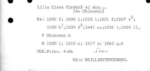 //// i Lilla Clara förebrå ej mig... //// (Av Choraeus) //// ^ Se: 1805 f; 1809 i;1810 1;1821 f;1827 v^; //// 1830 h^;1839 f^;1841 cc;1858 1;1859 11, //// F Choraeus b //// N 1800 1; 1815 c; 1817 e; 1860 g,h //// UUB.Folkv. 4:66 -jl^t^ //// KB:s SKILLINGTRYCKSREG. ////