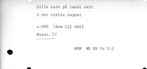 //// Lilla Lars pa taket satt //// ^ - - //// I det strida regnet //// . //// . //// s.400 (Arw III 465) //// - //// Nordl. //// ^ ARW MS KB Vs 2:2 ////