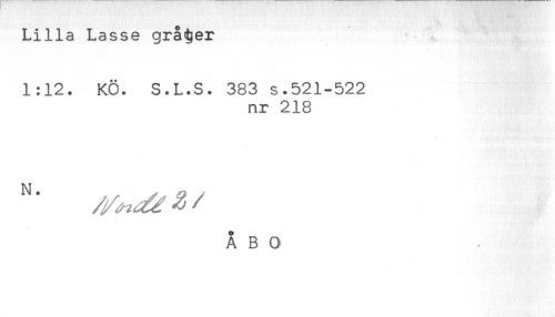 //// Lilla Lasse gråter //// 1:12. KÖ. S.L.S. 383 s.521-522 //// nr 218 //// ÅBO ////