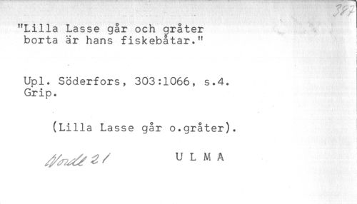 //// - t - - //// /"Lilla Lasse går och gråter //// borta är hans fiskebatar." //// ! //// i //// * . i //// Upl. Söderfors, 303:1066, s.4. //// Grip. //// * //// (Lilla Lasse går o.gråter). //// ULMA ////
