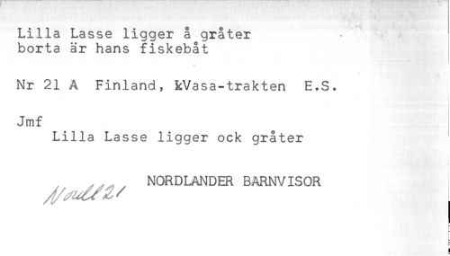 //// Lilla Lasse ligger å gråter //// borta är hans fiskebåt //// i //// * //// Nr 21 A Finland, Wasa-trakten E.S. //// . //// Jmf //// Lilla Lasse ligger ock gråter //// , NORDLANDER BARNVISOR ////
