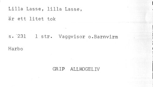 //// H //// Lilla Lasse, lilla Lasse, //// är ett litet tok //// * .... //// . - //// s. 231 1 str. Vaggvisor o.Barnvirm ! //// i //// H //// ) //// H //// Harbo : //// ! //// * //// GRIP ALLMOGELIV //// t //// t //// ! ////