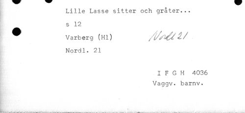 //// Lille Lasse sitter och gråter... //// s 12 //// * Varberg (Hl) //// Nordl. 21 //// - //// I F G H 4036 //// Vaggv. barnv. ////