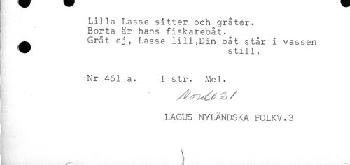 //// Lilla Lasse sitter och gråter. //// Borta är hans fiskarebåt. //// ^ Gråt ej, Lasse lill,Din båt står i vassen //// W still, //// Nr 461 a. 1 str. Mel. //// LAGUS NYLÄNDSKA F0LKV.3 ////