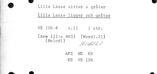 //// I Lille Lasse sitter o gråter //// Lilla Lasse ligger och gråter //// VS 126:4 S.ll 1 str. //// (Arw III:s 463) (Nordl.2l) //// AFZ MS KB //// KB VS 126 ////