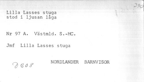 //// Lilla Lasses stuga //// stod i ljusan låga //// Nr 97 A. Västmld. S.-HC. //// Jmf Lilla Lasses stuga //// i //// t //// - //// * //// ^ ^ NORDLANDER BARNVISOR ////