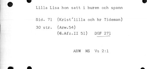//// Lilla Lisa hon satt i buren och spann //// Sid. 71 (Krist'lilla och hr Tideman) //// 30 str. (Arw.54) //// (€.Afz.II 51) DGF 271 //// ARW MS Vs 2:1 ////