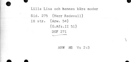 //// Lilla Lisa och hennes kära moder //// Sid. 275 (Herr Redevall) //// 18 str. (Arw. 54) //// (G.Afz.II 51) //// ] DGF 271 //// \ //// ARW MS Vs 2:3 //// K ////