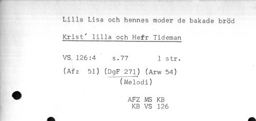 //// ' ' * ' . , ' -- . - - //// . //// Lilla Lisa och hennes moder de bakade bröd //// Krist' lilla och Hefr Tideman //// VS. 126:4 S.77 1 str. //// t //// (Afz 51) (DgF 27lJ (Arw 54) //// (Melodi) //// * AFZ MS KB //// KB VS 126 //// !''''- //// /