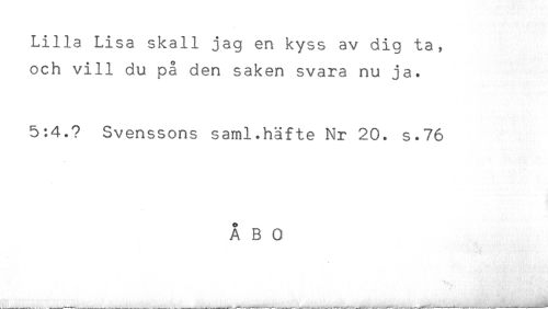 //// Lilla Lisa skall jag en kyss av dig ta, //// och vill du på den saken svara nu ja. //// 5:4.? Svenssons saml.häfte Nr 20. s.76 //// ÅBO ////
