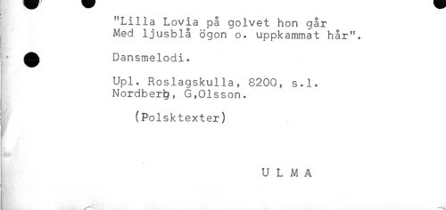 //// t //// !'-.' //// ! "Lilla Lovia på golvet hon går //// Med ljusblå ögon o. uppkammat hår". //// ^ Dansmelodi. //// Upl. Roslagskulla, 8200, s.l. //// ^ Nordberg, G,Olsson. //// { (Polsktexter) //// ULMA ////
