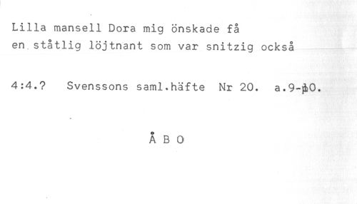 //// Lilla manseli Dora mig önskade få //// en.ståtlig löjtnant som var snitzig också //// 4:4.? Svenssons saml.häfte Nr 20. a.9-^0. //// ÅBO ////