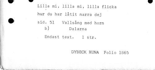 //// Lilla mi, lilla mi, lilla flicka //// hur du har låtit narra dej //// ^ sid. 51 Vallsång med horn //// b) Dalarna //// * //// Endast text. 1 str. //// DYBECK RUNA Folio 1865 //// L .. - . ////