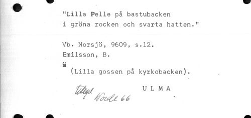//// "Lilla Pelle på bastubacken //// i gröna rocken och svarta hatten." //// - //// Vb. Norsjö, 9609, s.12. //// Emilsson, B. //// * + //// M //// (Lilla gossen på kyrkobacken). //// ^ ULMA //// t ////