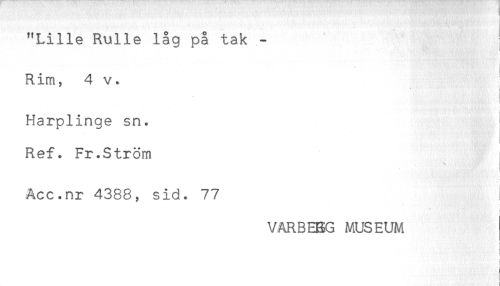 //// "Lille Rulle låg på tak - //// Rim, 4 v. ^ //// Harplinge sn. //// Ref. Fr.Ström //// Acc.nr 4388, sid. 77 //// VARBEBG MUSEUM ////