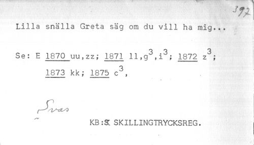 //// Lilla snälla Greta säg om du vill ha mig... //// i //// Se: E 1870 uu,zz; 1871 1872 z^; //// 1873 kk; 1875 c^, //// KBSKILLINGTRYCKSREG. ////