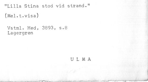 //// "Lilla Stina stod vid strand." //// (Mel.t.visa) //// Vstml. Hed, 3893, s.8 //// Lagergren //// t //// ULMA ////