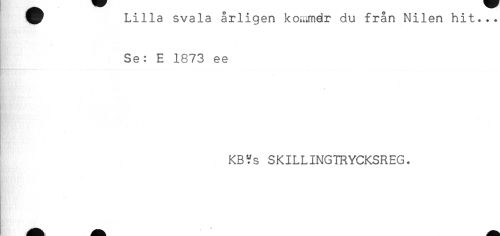 //// Lilla svala ärligen kommetr du fran Nilen hit.. //// Se: E 1873 ee //// KBTs SKILLINGTRYCKSREG. //// — ////