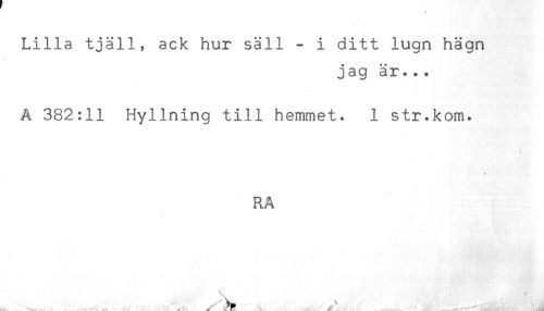 //// Lilla tjäll, ack hur säll - i ditt lugn hägn //// jag är. .. //// A 382:11 Hyllning till hemmet. 1 str.kom. //// RA //// 1 :.....i ^ ' V y ' . ..... ......-v ' "" i: ^ '.'ål ////