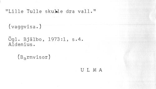 //// "Lille Tulle skuMe dra vall." //// (vaggvisa.) //// Ögl. Bjälbo, 1973:1, s.4. //// Aldenius. //// (Barnvisor) //// ULMA ////